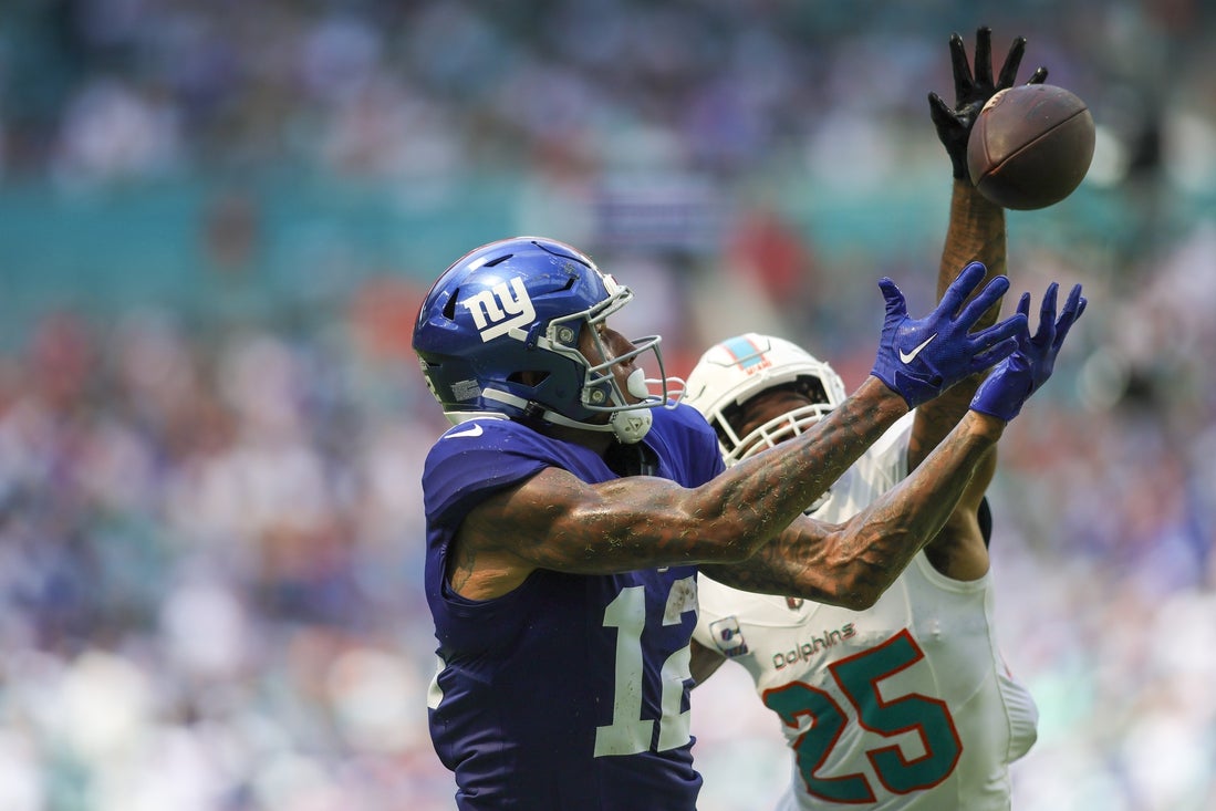 Oct 8, 2023; Miami Gardens, Florida, USA; New York Giants tight finish Darren Waller (12) reaches for the soccer however can not make a catch towards Miami Dolphins cornerback Xavien Howard (25) throughout the second quarter at Arduous Rock Stadium. Necessary Credit score: Sam Navarro-Imagn Photographs Darren Waller is returning to the NFL this season with the Miami Dolphins, brokers Drew Rosenhaus and Robert Bailey confirmed to ESPN on Monday.